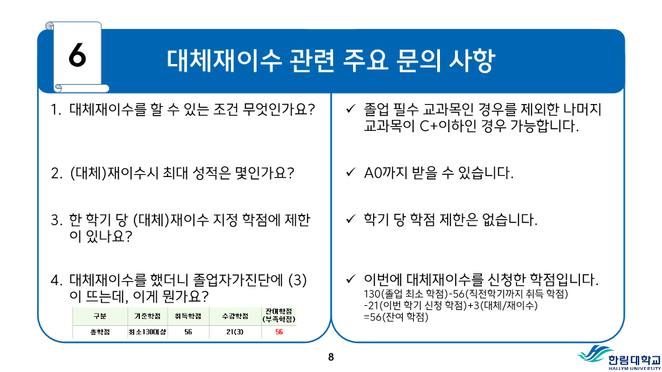 fnctId=bbs,fnctNo=487 RSS 2.0 게시물 검색 제목 작성자 검색어 입력창 게시글 리스트 등급기준 등 성적평가 방식 안내 성적<시험>시험은 정기시험, 비정기시험, 추가시험, 재시험 등으로 구분한다.1) 정기시험 : 중간시험과 학기말시험으로 나누며 중간시험은 학기 당 수업일수 2분의 1이 되는 주에 실시하고, 학기말시험은 학기의 최종 주에 실시한다.2) 비정기시험 : 과제학습, 세미나 등 계속적인 학습활동을 평가하는 시험으로 담당교수의 책임 하에 실시한다.3) 추가시험 : 질병 또는 부득이한 사정으로 정기시험에 응시할 수 없는 학생은 사유와 증빙서류를 첨부하여 추가시험신청서를 제출하여 허가를 받아 정기시험 종료 후 2주일 이내에 추가시험에 응시할 수 있으며 이 경우 성적은 B+를 초과할 수 없다.4) 재시험 : 의과대학, 간호대학에 한하여 실시하며 의예과, 의학과 및 간호학과의 교과목 중 학기말 성적이 40-59점일 때 1회에 한하여 학기말시험 종료 후 2주일 이내에 재시험을 허가할 수 있으며, 성적은 C+를 초과 할 수 없다.시험 부정행위자의 처리1) 시험 중 부정행위가 적발되면 감독교수는 그 행위내용을 시험지 상단에 기록하고 날인한 후 즉시 총장에게 보고한다.2) 시험 부정행위자에 대하여는 다음의 내용에 따라 제적 또는 유기정학 처분한다.가) 제 적- 시험에 대리로 응시하거나 대리응시를 부탁한 경우- 시험지에 다른 사람의 이름을 쓰거나 쓰게 한 경우- 부정행위자로 적발되어 징계처분을 받은 사실이 있는 학생이 거듭 부정행위를 한 경우 나) 유기정학- 시험 중 책, 노트, 메모 등 허락되지 않은 것을 본 경우- 다른 학생의 답안지를 보거나 보여준 경우와 그 밖의 부정행위로 인정되는 행위를 한 경우 <성적>성적평가1) 성적평가는 각 교과목의 시험성적, 과제평가, 출석상황 및 학습태도 등을 종합하여 평가하되 출석 및 학습태도 10-20%, 정기시험 50-70%, 비정기시험 및 과제 20-30%로 함을 원칙으로 한다.2) 성적의 등급은 다음과 같이 분류하여 표기한다. 성적 등급 안내등급평점등급평점A+4.5D+1.5A04.0D01.0B+3.5F0.0B03.0P(Pass)없음C+2.5N(Non Pass)없음C02.0 3) 이수한 교과목의 성적이 D0급 이상 또는 P일 경우는 학점을 취득한 것으로 인정한다.4) 등급에 따른 백분위 기준점수 표 등급에 따른 백분위 기준점수 표 등급평점백분위 기준점수A+4.599A494B+3.589B384C+2.579C274D+1.569D164F0595) 전공과목의 성적평가 등급기준 전공과목의 성적평가 등급기준구분A이상B이상C~F비고이론35% 이하70% 이하잔여비율 3-3-0이론+실습40% 이하잔여비율 실습45% 이하 4-2-2예외과목50% 이하잔여비율 *예외과목: 15명 미만 과목, 영어과목, 교직과목 등*잔여비율: 담당교수 재량6) 기초․교양교과목의 성적평가 등급기준 기초․교양교과목의 성적평가 등급기준구분A이상B이상D~F비고일반과목30%60% 이하20%이하 예외과목절대평가 * 예외과목: 20명 미만 과목, 영어과목, RC과목 등* 출석 미달로 인해 F등급을 부여한 학생 및 교환학생은 등급 비율대상에서 제외7) 교과목 주당 수업시간의 3배를 초과하여 결석하였을 때 출석 미달로 F등급을 부여한다. 다만 담당 교수가 3배를 초과하지 않는 범위에서 자율적으로 정할 수 있으며, 수업계획서에 표시해야 한다. 또한, 3회의 지각은 한 번의 결석으로 본다.8) 학기 중 휴학한 학생의 휴학학기 성적은 인정하지 아니하며 그 학기의 수강신청은 취소된다.9) 각 교과목의 담당교수 및 강사는 학기말시험 종료 후 10일 이내에 담당교과목의 성적을 게시하고 통합정보시스템에 접속하여 웹으로 성적입력을 완료하여야 한다. <성적의 정정>1) 제출된 성적은 기재착오(성적의 오기 또는 누락) 등 부득이한 사유가 있는 경우에 한하여 총장의 허가를 받아 정정할 수 있다.2) 성적정정 절차가) 학생은 성적을 조회 확인하여야 하며, 성적에 이의가 있을 경우 담당교수에게 성적이의신청을 하여야 한다.나) 담당교수는 학생으로부터 이의신청을 받은 후 이를 검토하여 사유가 인정될 경우 학기말시험 종료 후 2주 이내에 사유서 및 증빙자료를 첨부한 성적정정원을 교무팀에 제출한다.다) 학생이 성적확인/정정기간에 정정신청을 하지 않은 경우에는 추후 성적에 대한 이의를 제기할 수 없다.3) 방학기간 중 수업, 해외현지수업 등 학기말시험 종료 후 10일 이내에 성적제출이 곤란한 교과목의 경우에는 성적제출 및 정정기간을 따로 정하여 시행할 수 있다. 성적평점평균의 계산1) 과목별 성적평점의 계산은 그 과목의 학점수와 성적등급의 평점을 곱하여 산출한다. 2) 성적평점평균의 계산은 학점을 사용한 가중평균법에 의하며, 소수 세째자리에서 반올림한다.3) 총 성적평점평균의 계산에는 재이수 교과목의 이전 성적은 산입하지 아니한다.4) 취득학점수가 다르고 성적평점평균이 동일한 경우에는 학점계가 많은 학생을 우선한다. 5) 성적등급이 P와 N으로 표시되는 교과목의 학점 및 성적은 성적평점평균 및 순위계산에서 제외한다.<성적경고와 유급, 우등생>1) 성적경고 가) 학기말 성적평점평균이 2.00 미만(의예과 2.20 미만)인 경우에는 예비성적경고를 한다.나) 신입생의 1학년 1학기 성적경고는 적용하지 아니한다. 다만, 의예과 학생은 
