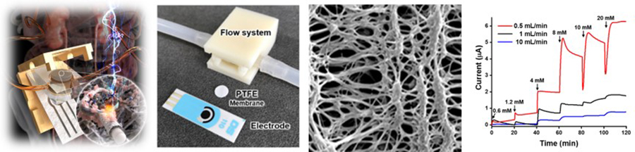 - 최근 오간온어칩, 인공장기 등의 연구가 활발해짐에 따라 유속조건에서 측정이 가능한 바이오센서의 필요성이 더욱 증가하고 있습니다. MIN Lab.에서는 기능성 고분자 박막 코팅 등의 표면개질 및 증착 공정기술을 활용하여 유속조건에서도 측정이 가능한 실시간 모니터링용 바이오센서 연구를 수행하고 있습니다. 상온에서 기상증착이 가능하며, 기능성 아민(amine)기를 가지는 파릴렌-A(parylene-A)의 코팅을 통하여 다공성 막의 표면개질을 진행하고, 고밀도로 개질된 표면 아민기를 활용하여 효소를 고정화 하였습니다. 이를 유속 챔버에 장착하고 유속조건하에서 요독 모니터링을 실시한 결과, 10 mL/min의 고유속 조건에서도 요독 측정이 가능함을 확인하였습니다. 또한 복막투석액, 혈청 등의 시료에서도 측정이 가능함을 확인하였습니다.